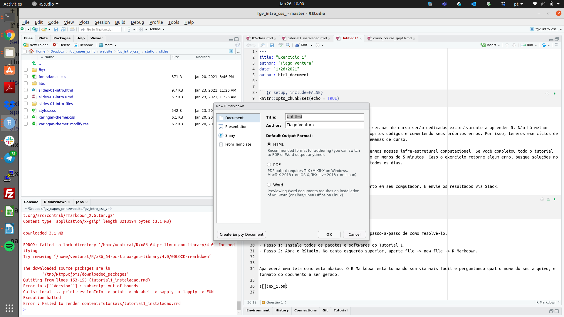 Aparecerá uma tela como esta abaixo. O R Markdown está tornando sua via mais fácil e perguntando qual o nome do seu arquivo, e formato do documento a ser gerado. Selection a segunda opção .pdf e altere o nome do arquivo para “exercicio 1”